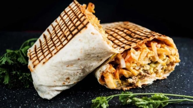 This image presents a mouthwatering Tacos sandwich, perfectly grilled to a golden crisp. Stuffed with juicy chicken, melted cheese, and a mix of fresh vegetables, it offers a rich combination of textures and flavors. The grill marks on the tortilla add a satisfying crunch, while the creamy filling inside makes every bite irresistible.