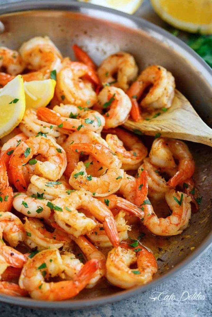 Add in the remaining butter, lemon juice and water. Cook, while stirring, until the butter melts and the shrimp have cooked through (do not over cook them). Take off heat. Taste test, and add more lemon juice, salt or pepper, if needed to suit your tastes.