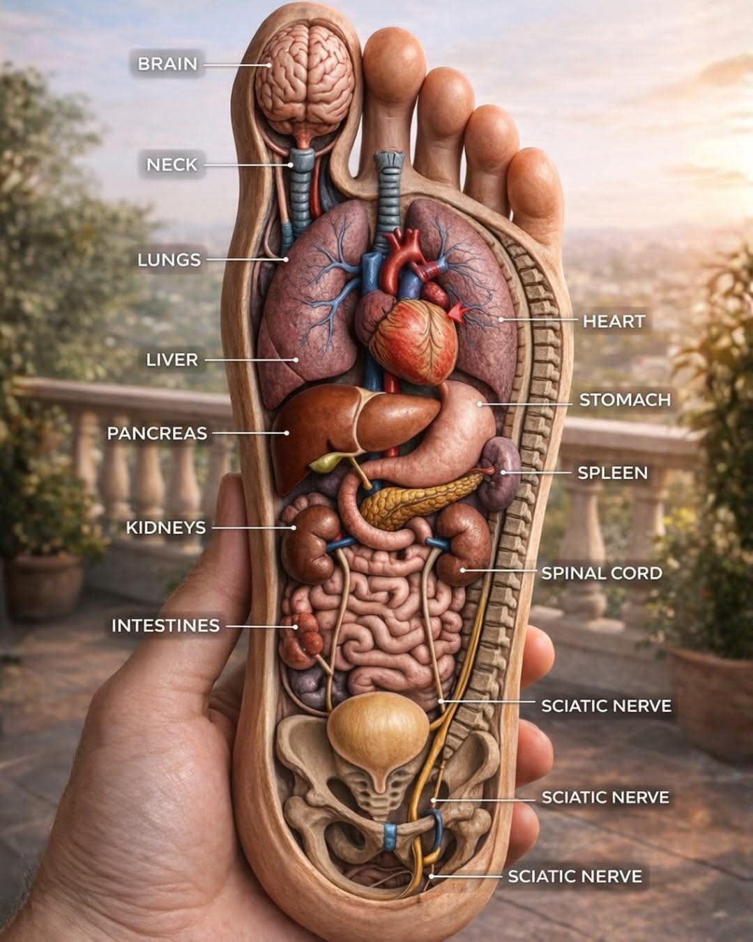 The image you shared is inspired by reflexology, a concept suggesting that different areas of the feet correspond to organs in the body—like the heart, lungs, liver, and even the brain.